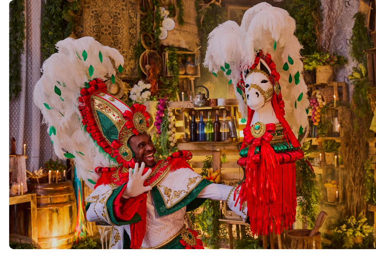 Os tambores evocam o Xamã Babalaô em uma homenagem à musicalidade amazônica e às tradições do Sairé, manifestação que mescla influências indígenas e católicas, hoje preservada na comunidade do Carvão.